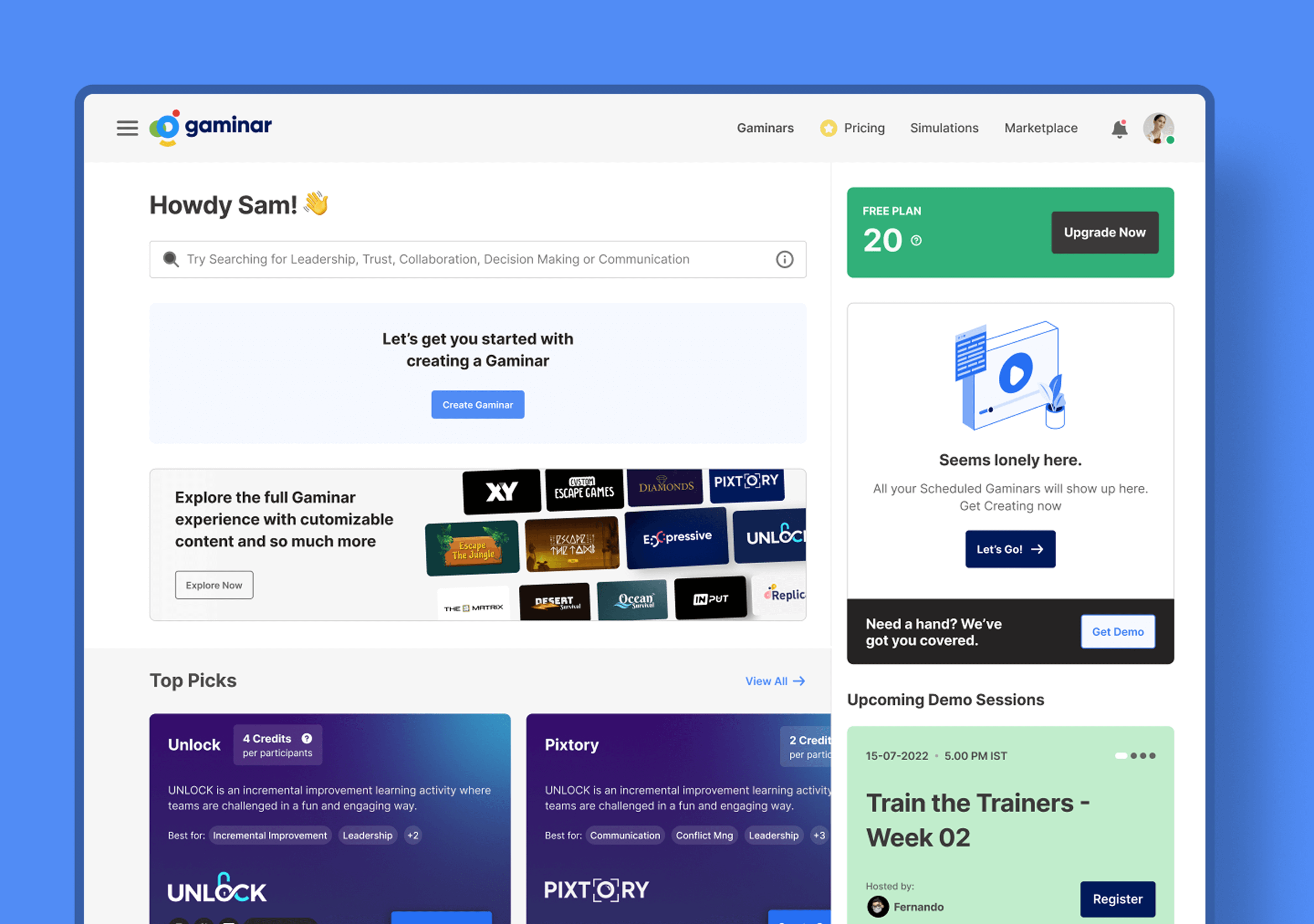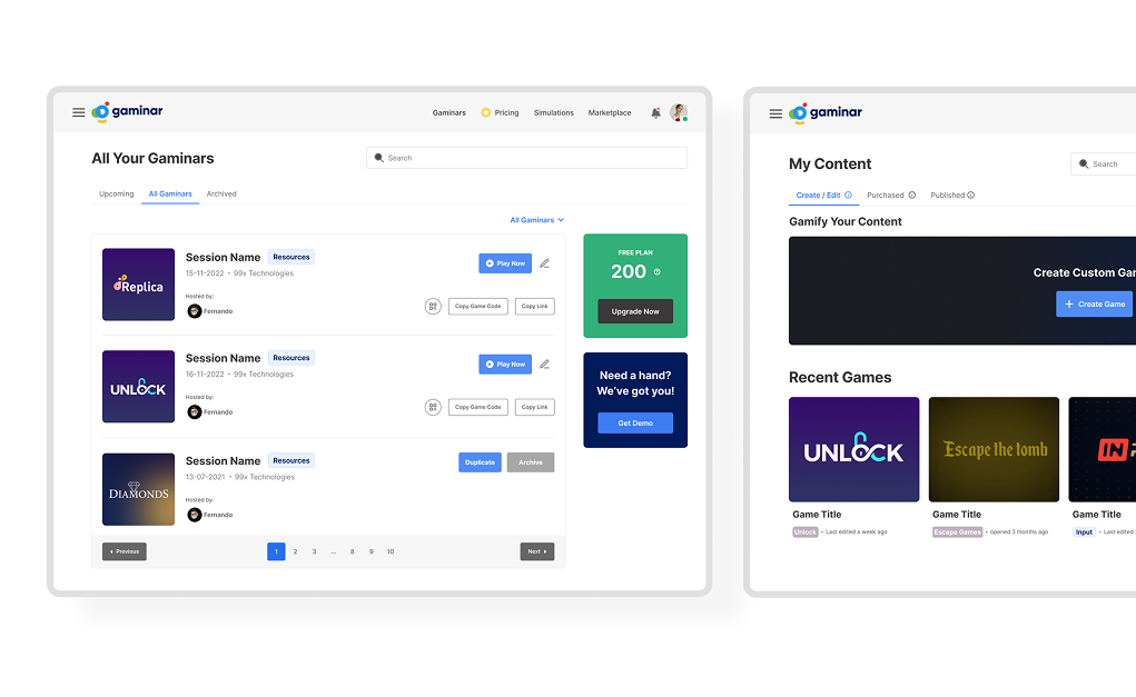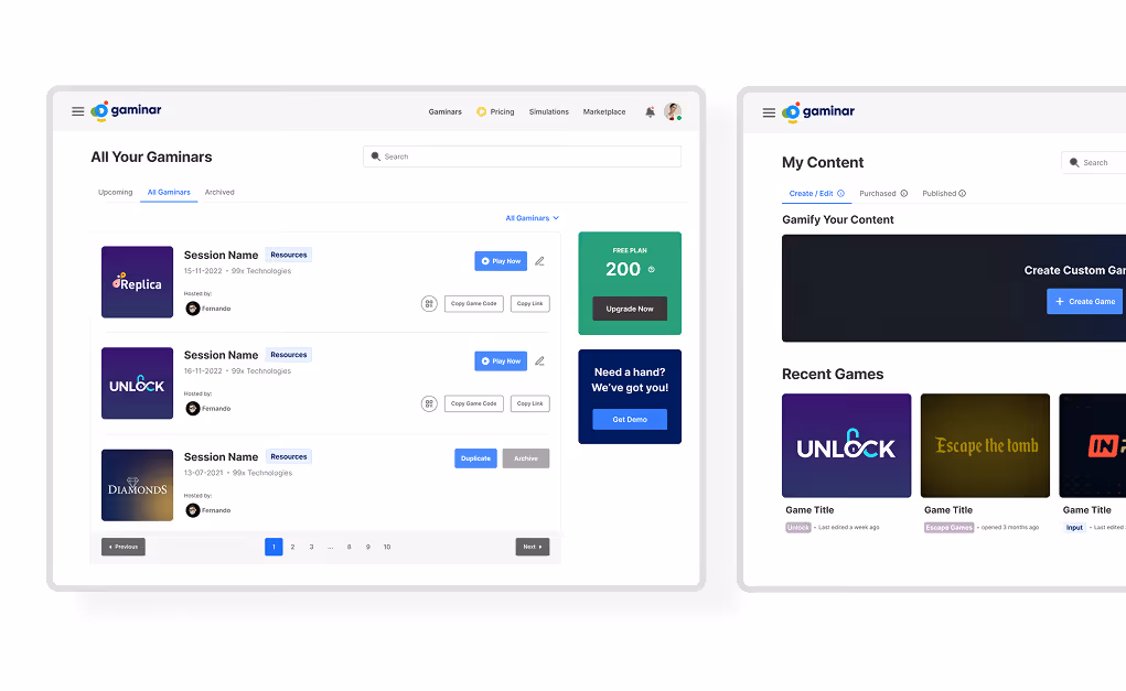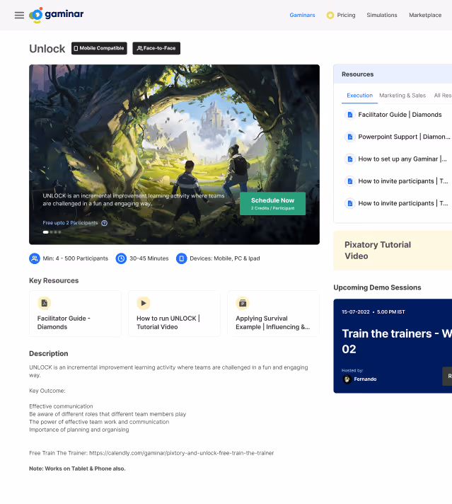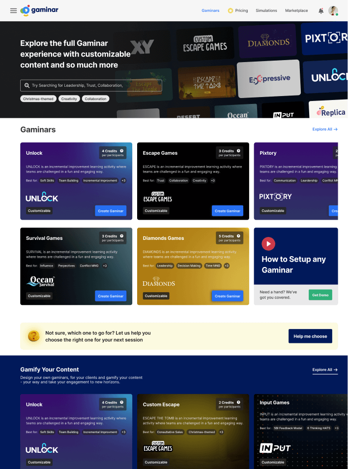Gaminar.net enables facilitators to deliver virtual, hybrid, and in-person experiential learning programs and team-building activities. Using simulations and gamified webinars, the platform engages users worldwide, transforming the learning experience.