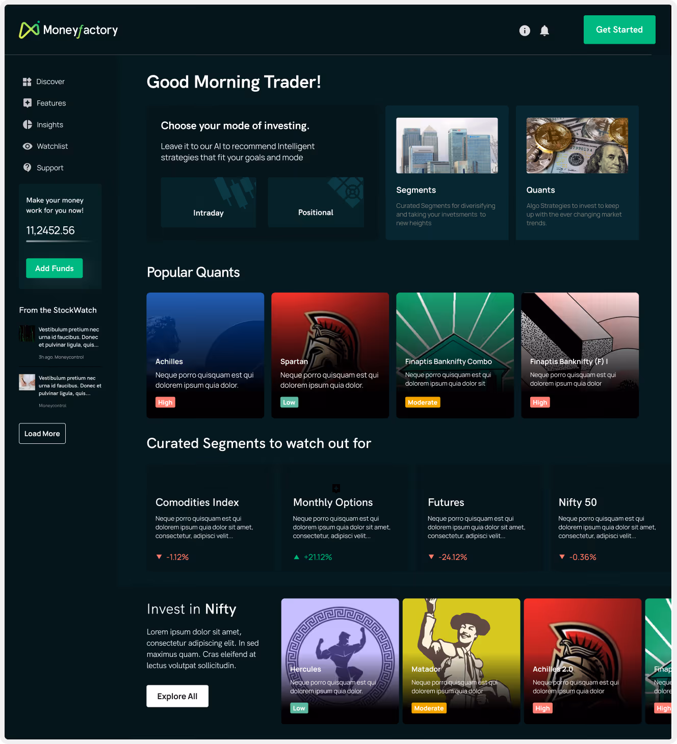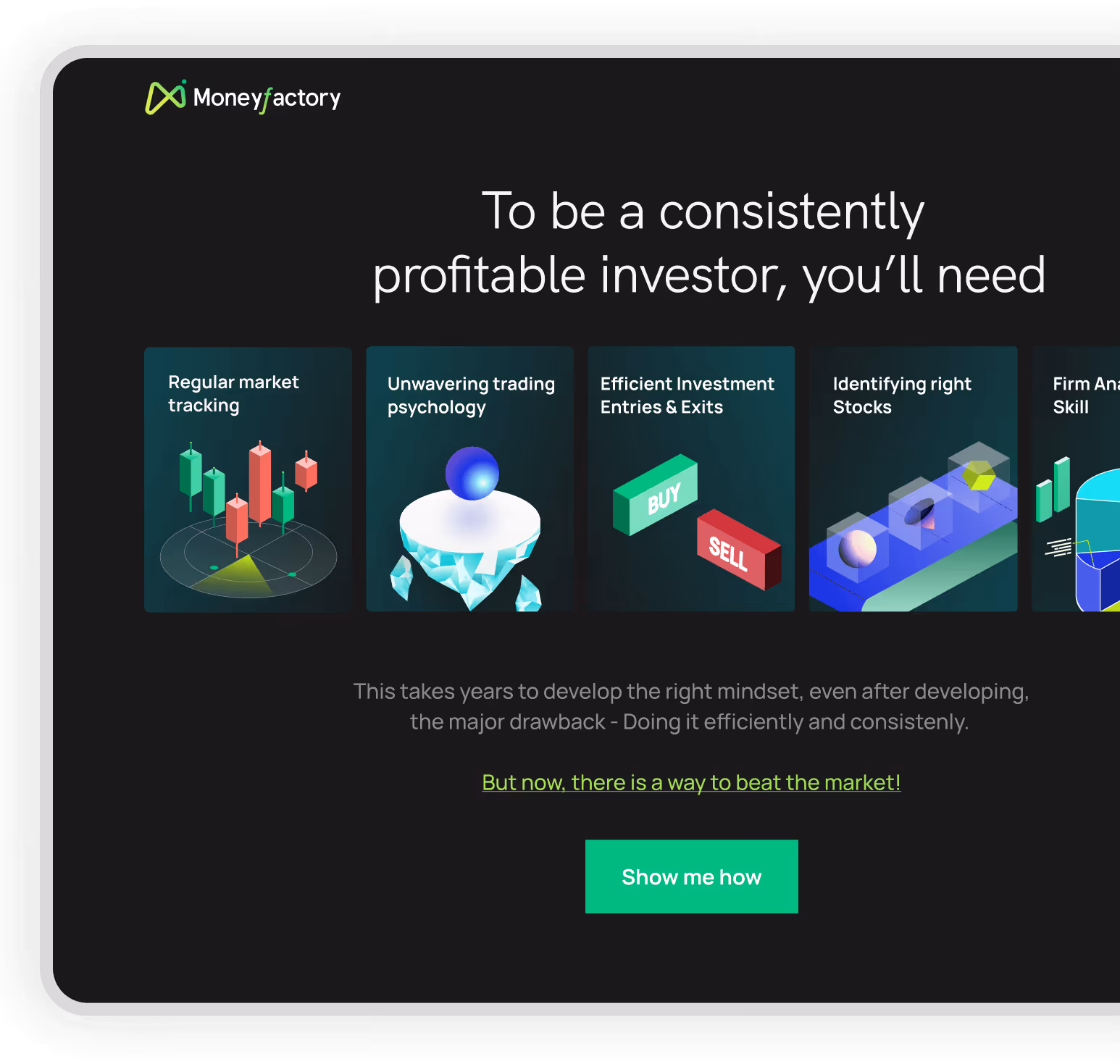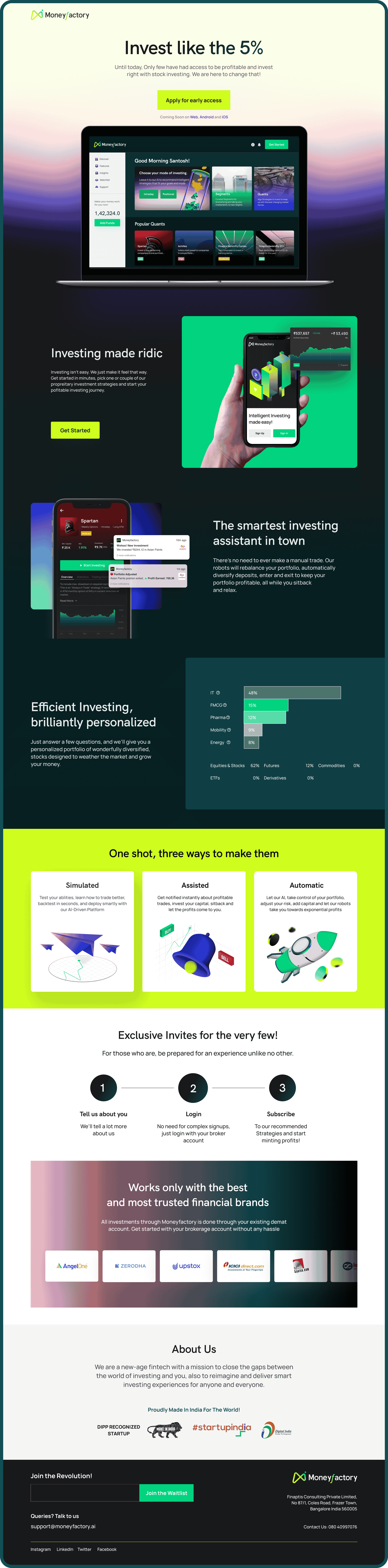We were invited to help redefine the Moneyfactory’s brand - its expression, the product and the website— so that, as Moneyfactory forges this new future, its brand will match its ambition - Make Investing Ridiculously Smart & easy for anyone and everyone who needs it.